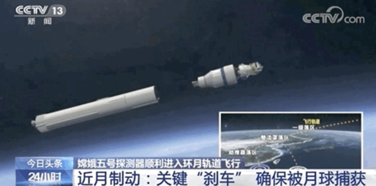 大陸官媒《央視》報導,「嫦娥五號」探測器於28日晚間8點58分成功啟動「煞車」制動,順利進入環月軌道。