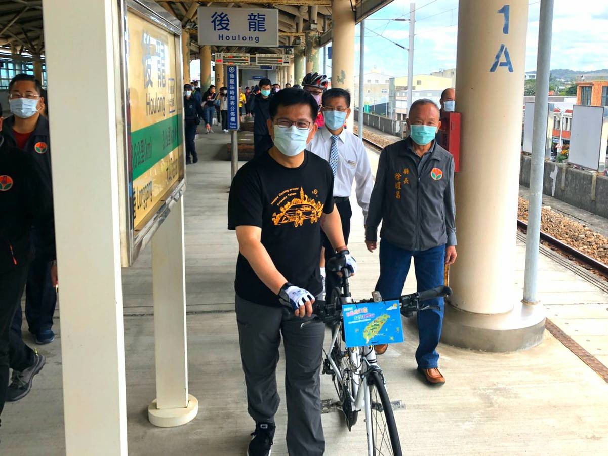 ▲交通部長林佳龍率交通部及鐵道局、觀光局、台鐵局等各機關一級主管,以接力的方式騎自行車環島一週。(圖/台鐵提供)