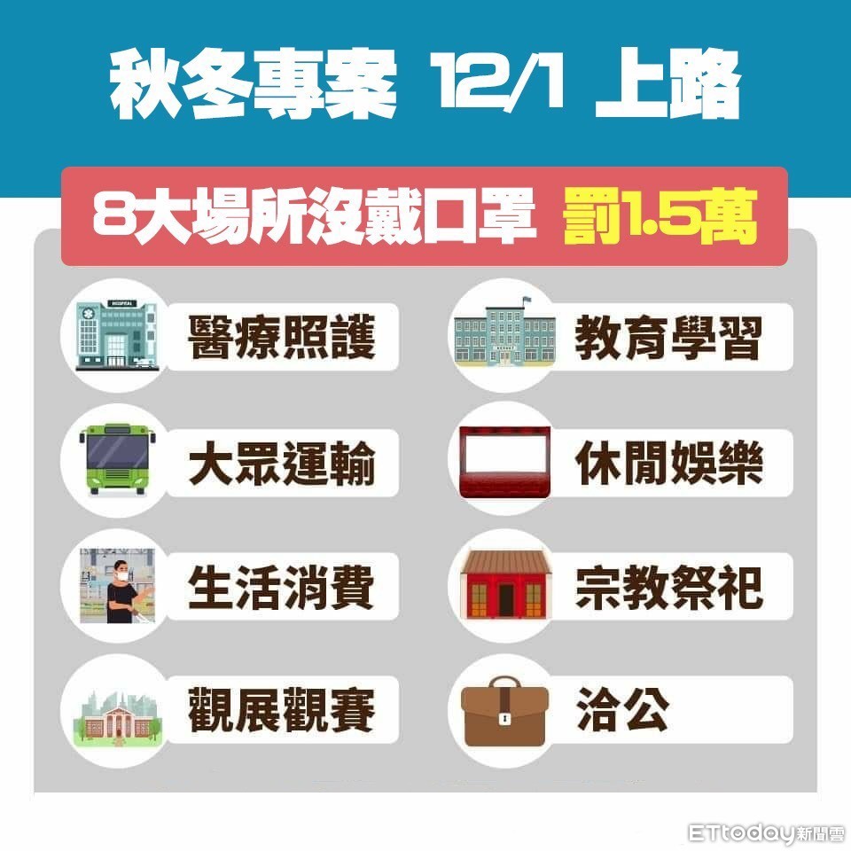 中央疫情指揮中心公布,自12月1日起啟動秋冬防疫專案,分為社區防疫、邊境檢疫、醫療應變三大方向,請民眾進入八大類人潮擁擠或密閉場所需戴口罩。