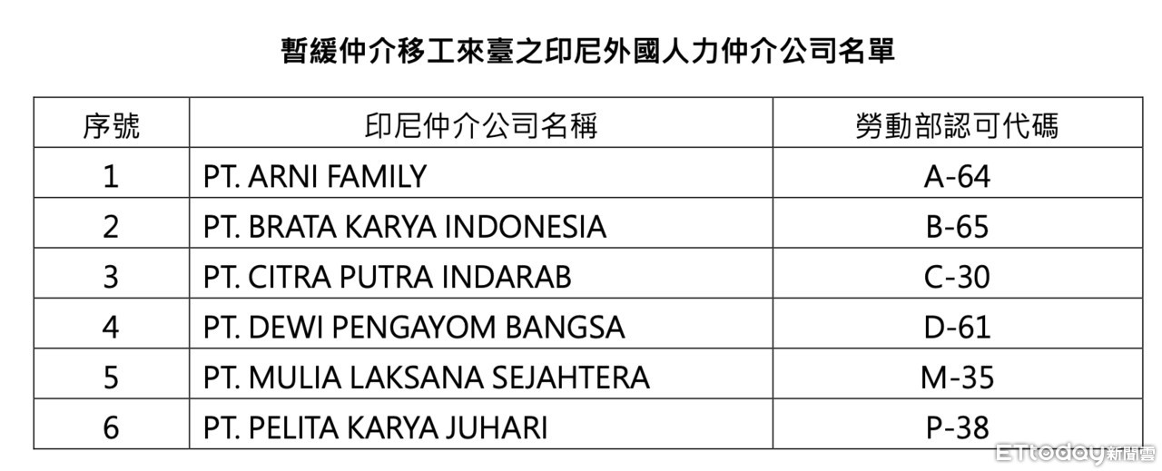 中央流行疫情指揮中心今日晚間公布,為維護國內防疫安全及減少印尼籍移工境外移入病例持續發生,即起新增暫緩「PT. ARNI FAMILY」、「PT. BRATA KARYA INDONESIA」、「PT. CITRA PUTRA INDARAB」、「PT. DEWI PENGAYOM BANGSA」、「PT. MULIA LAKSANA SEJAHTERA」、「PT. PELITA KARYA JUHARI」共6家印尼外國人力仲介公司仲介移工來台工作,截至目前我國共暫緩14家印尼外國人力仲介公司仲介移工來台工作。