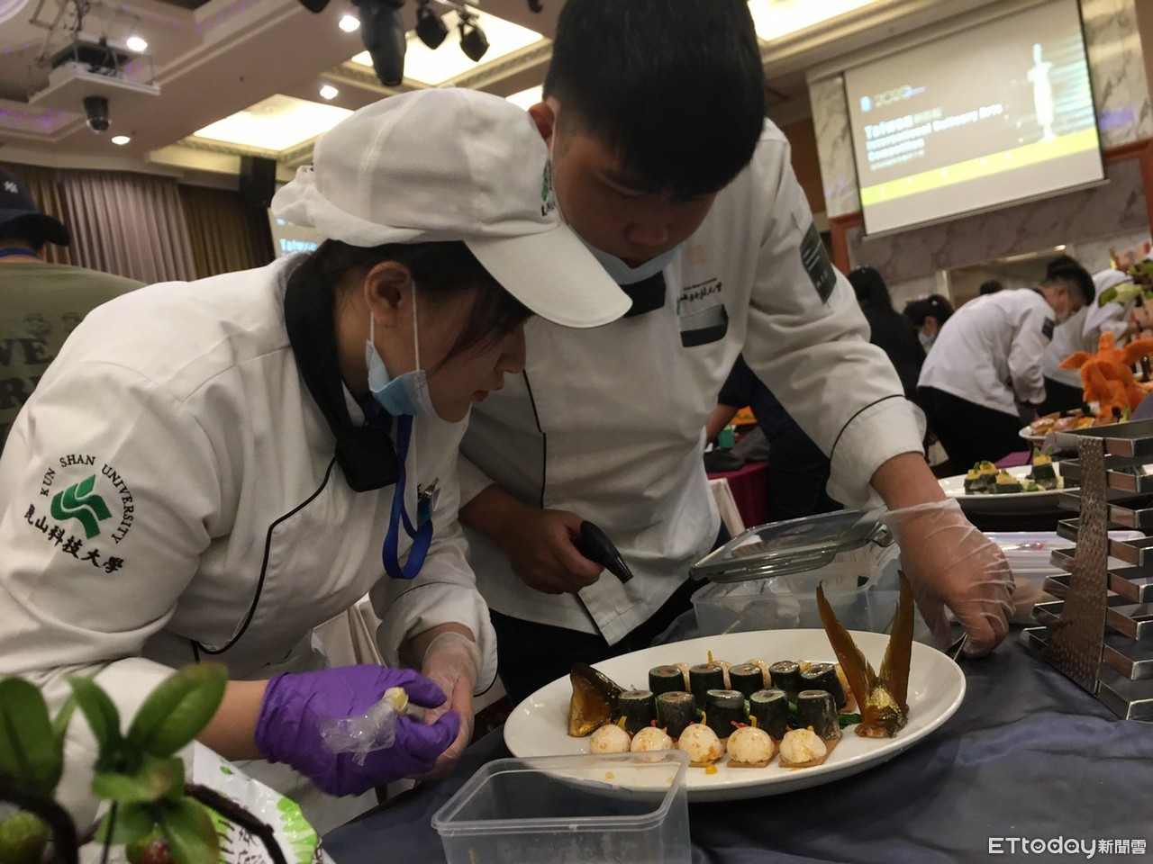 ▲國際廚藝美食藝術大賞在台南長榮酒店舉行,崑山科技大學餐飲管理及廚藝系由林文麒副主任領軍參賽,獲頒獲大會最高榮譽團體總冠軍。(圖/記者林悅翻攝,下同)