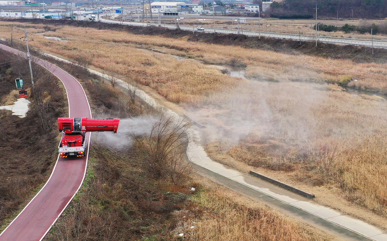 ▲南韓京畿道利川市於11月20日驗出高病原性禽流感病毒株,當局對河川進行消毒工作。(圖/達志影像)