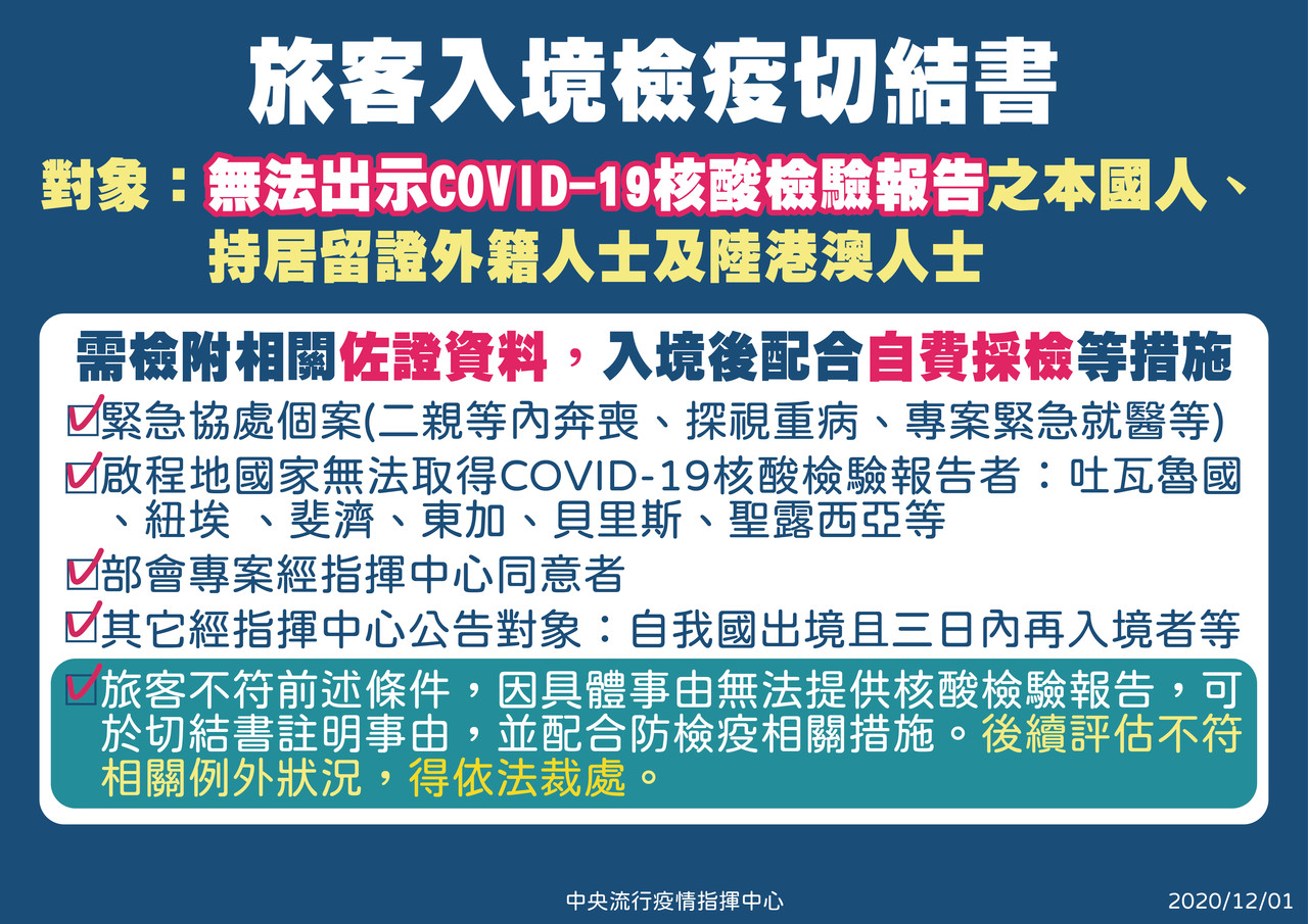中央流行疫情指揮中心今舉行臨時記者會,恰巧是12/1秋冬專案執行第一天,指揮中心也再次說明相關規定,其中「入境簽切結書」規定,也提出5大類狀況,可以入境後免裁處,包括「緊急協處個案、當地國家沒辦法篩檢、部會專案經指揮中心同意、出境三日內再入境和其他事由說明。」