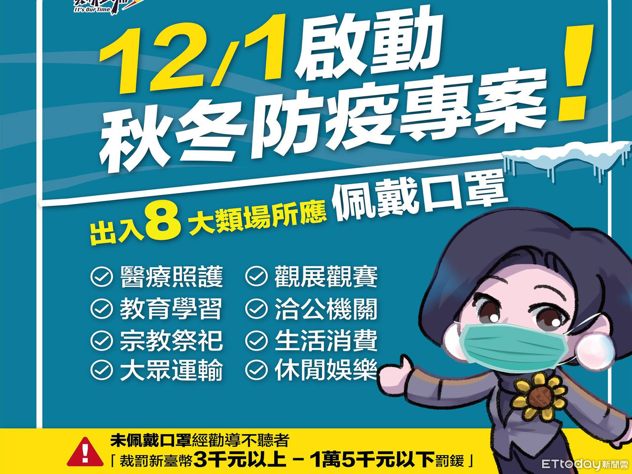▲「秋冬防疫專案」,自12月1日起啟動,民眾進出公共場所全程需配戴口罩,並落實實名登記制,違者經勸導不聽,將可依規定裁罰新台幣3000元以上至1萬5000元以下罰鍰。(圖/雲林縣政府提供)