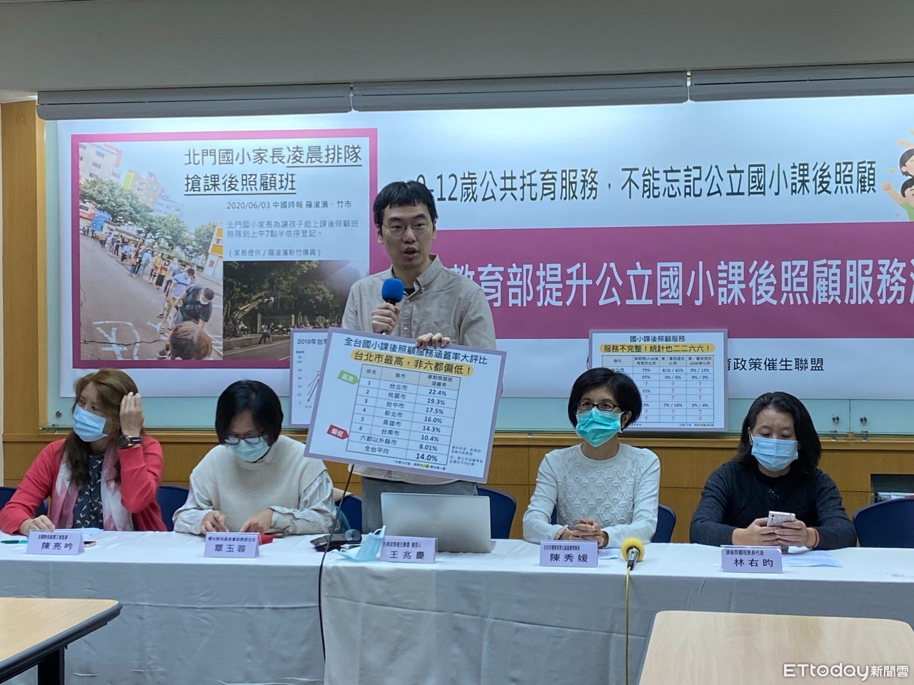托育盟發言人王兆慶指出,共托育服務各階段都是抽識、排隊、量能不足,6-12歳國小課務尤其能見度有限。但共實無論6-12歳或2-6歳公共托育的問題都是一樣的「課後照顧收托時間與家長工時不相容」,平日早早就下課,寒暑假又間不符合家長需求的公共托育服務,形同沒有服務,家長難以兼兒,認為台灣的公立國小課後照顧服務的量能還需要再加強。