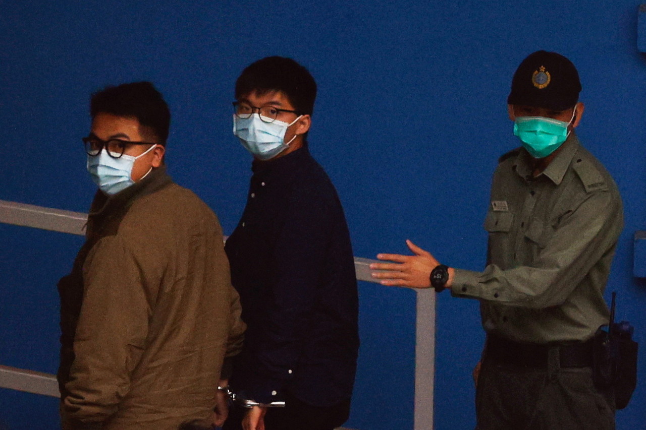 ▲香港眾志前秘書長黃之鋒(中)、前主席林朗彥(左)入獄。(圖/路透社)