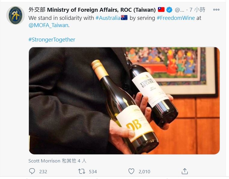 中國近日對澳洲葡萄酒課徵報復性稅額,甚至以假訊息攻擊澳軍。各國政要因而響應,「買澳洲葡萄酒,抵抗專制」(#freedomwine)的公民運動。對此,外交部2日也在推特上貼出澳洲葡萄酒照片,表達採用澳洲的是「自由紅酒」(freedom wine), 因為台灣與澳洲「站在一起更堅強」(stronger together)。