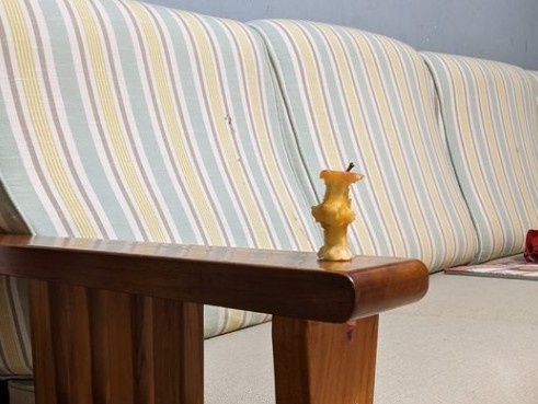 王婉諭昨晚PO出一張吃到剩果核的蘋果的照片,指出「忙完家務看到這個,以為家裡多了一個燭台,大寶把吃完的蘋果好好的放在沙發扶手上,不像雙寶那樣,不小心掉在地上、沙發縫隙中,讓我感到非常欣慰阿!」