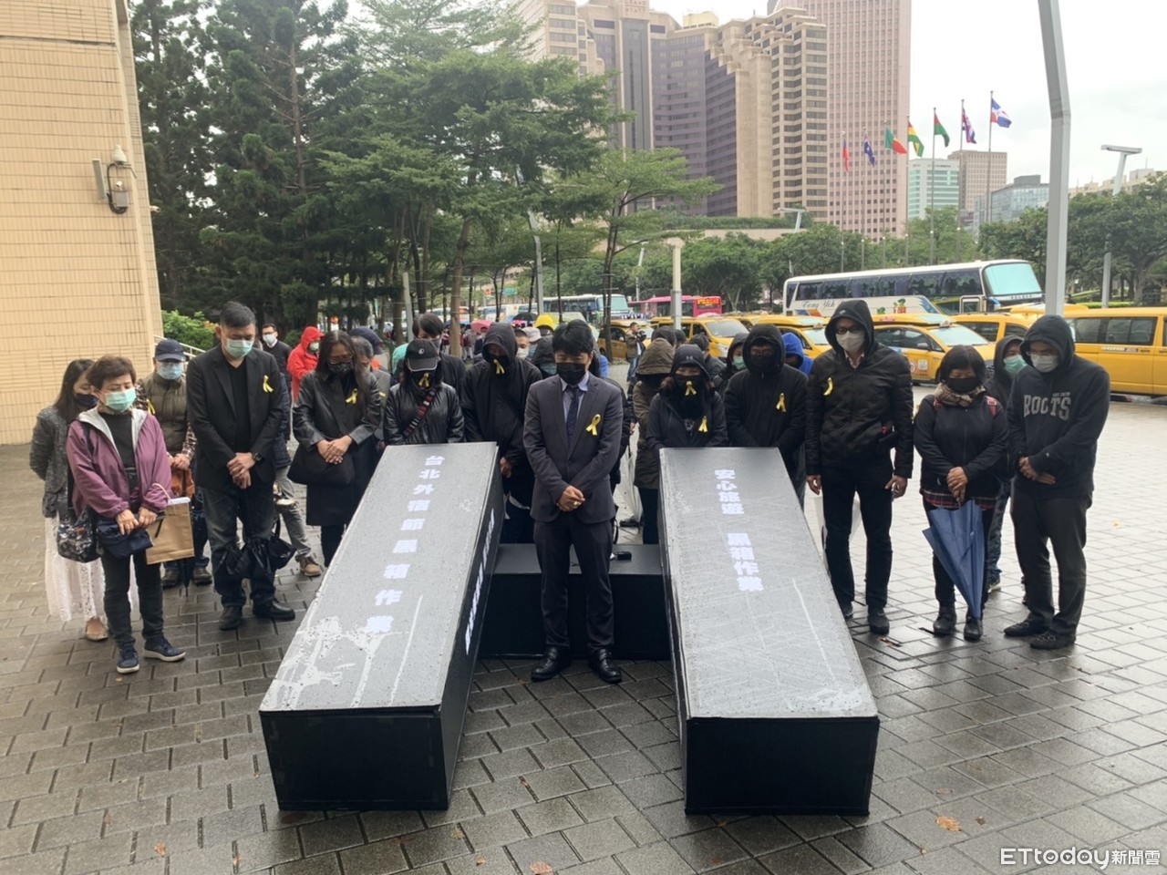 台北市旅館商業同業公會槓上台北市政府觀傳局,今(3日)下午在台北市旅館商業同業公會理事長韋建華的帶領下,10數人身穿黑衣、配戴黃絲帶,更攜帶黑色棺材到台北市政府陳情,抗議觀傳局在「台北外宿節」活動圖利特定業者,且安心旅遊補助已等了半年都尚未撥發,業者已自行墊付約3億,觀傳局除駁斥公會指控,也表示旅遊補助預計明年1月審查完畢。