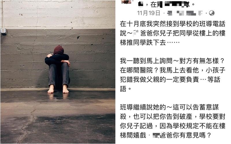 家長在臉書透露,上月底突然接到導師來電表示:「你兒子把同學從樓梯上推下去」,網友一聽隨即關心對方狀況,並表明會負責到底。但導師卻接著說:「這可以告蓄意謀殺,也可以把你告到破產,學校要對你兒子記過,因為學校規定不能在樓梯間嬉戲」,並詢問家長「有沒有意見?」