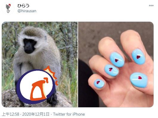 日本一名女子1日在推特秀出天空藍的美甲,沒想到卻意外與黑面長尾猴(Chlorocebus pygerythrus)的蛋蛋撞色。對比照片在網路上公開後,不僅登上日本電視節目,也笑翻許多網友,並紛紛留言調侃,「哈哈哈,笑死」、「快把兩手兩腳的指甲都塗滿,這樣就是1比20,壓倒性的勝利」。