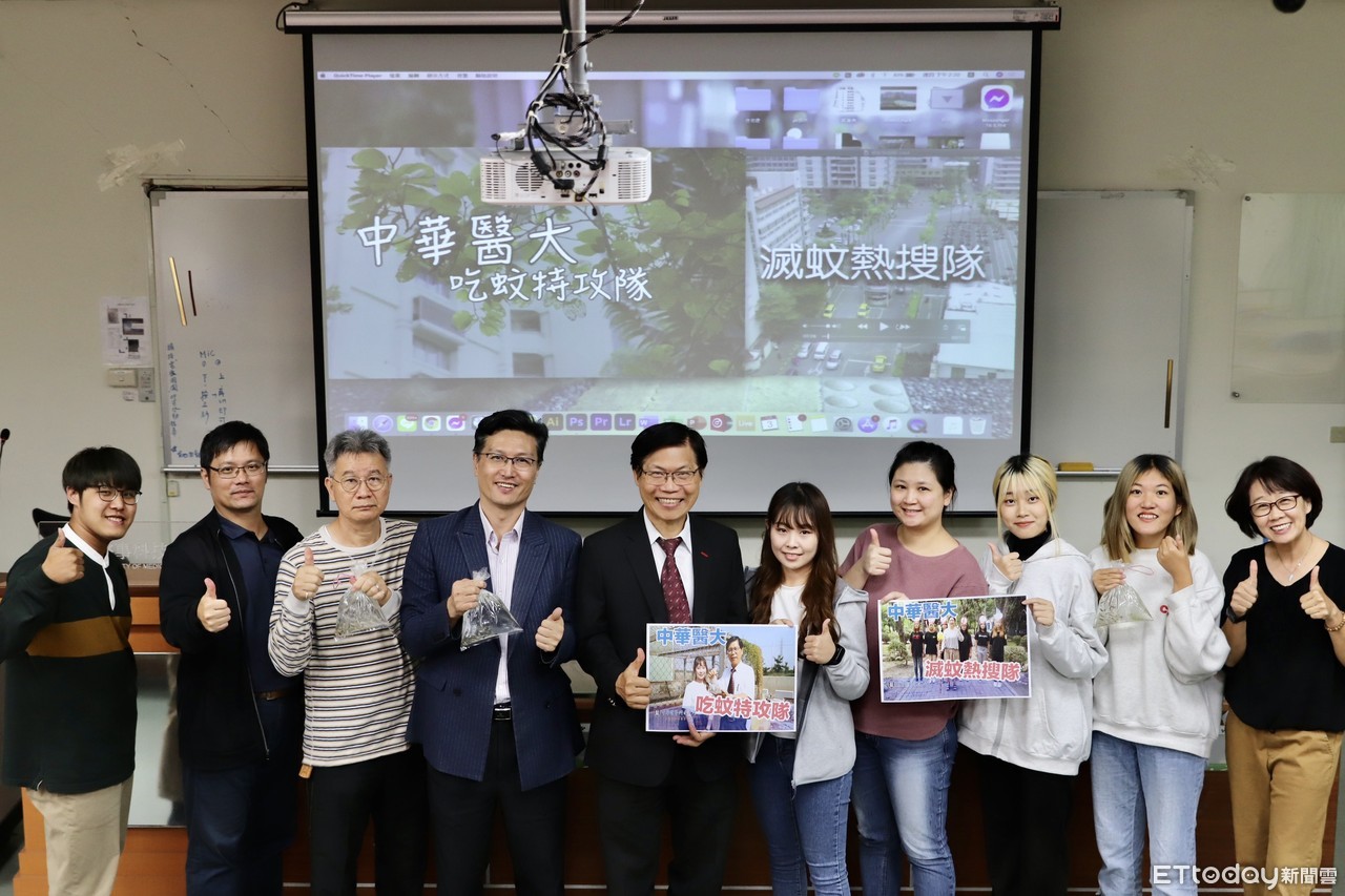 ▲中華醫大實踐計畫USR團隊自製《A吃蚊ㄟ特攻隊》、《病媒蚊熱搜隊》宣導影片,曾信超校長(左五)等參與拍攝的師生一起出席影片發表會。(圖/記者林悅翻攝,下同)