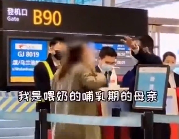 ▲大陸一名自稱哺乳媽媽的女子大鬧機場,影片在網路瘋傳。(圖/翻攝自青蕉拍客,下同)