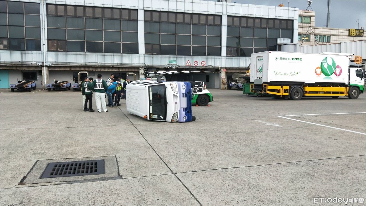 這起意外發生在6日清晨6時許,一輛長榮航空作業車由東向西B8往B9機坪方向行駛,但途中疑似遭到一輛停放在機坪的空廚車擋住視線,與華航機務車發生碰撞,導致華航機務車當場側翻,駕駛受傷。