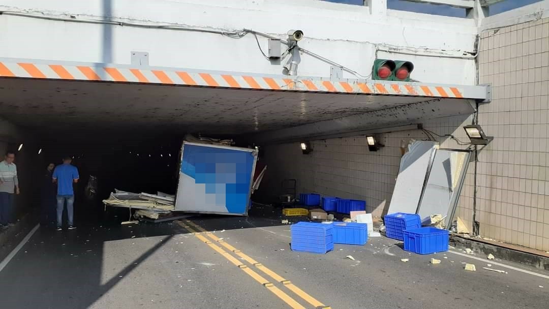 ▲嘉義一輛物流貨車硬闖民雄地下道後翻車,導致後方貨櫃裡早餐原料全散落一地(圖/翻攝臉書社團「民雄大小事」,下同)