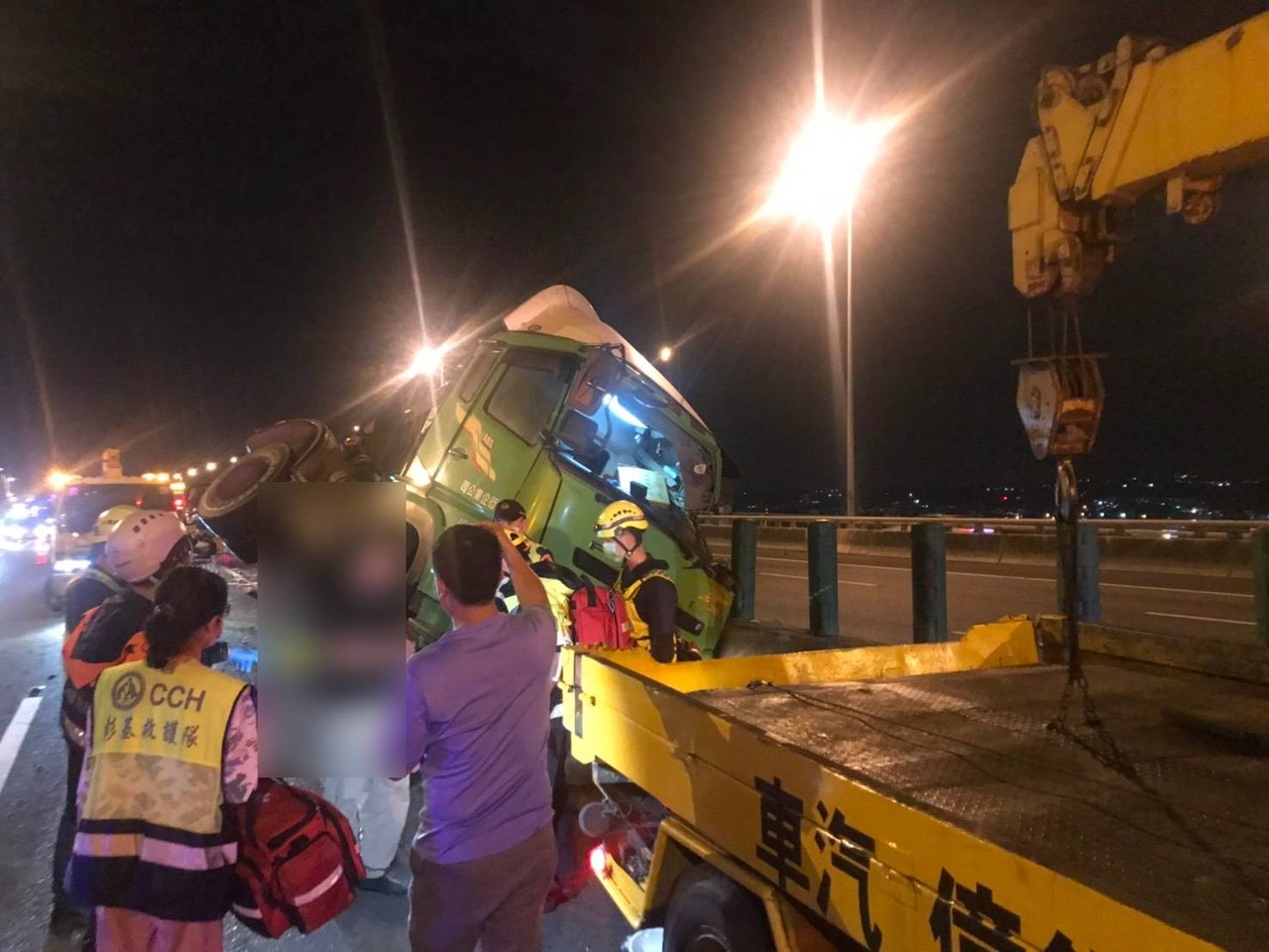國道3號北上195公里處晚間18時47分發生載滿飼料的大貨車與自小客車碰撞翻覆的意外事故,車頭卡在中央分隔島,車身毁損,駕駛也被夾在車內,彰化消防局緊急到場救援,駕駛被救出時,身體多處擦撕裂傷送秀傳醫院急救,所幸自小客車一家4口無生命危險,至於車禍的肇事原因,有待進一步釐清。