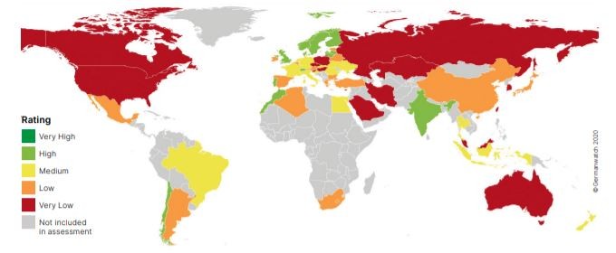 今年在全球墊底的國家和去年雷同,倒數的兩個名次依然由美國和沙烏地阿拉伯承包,接下來則為倒數第三的伊朗和倒數第四的加拿大,台灣今年比去年進步2名,來到倒數第五。