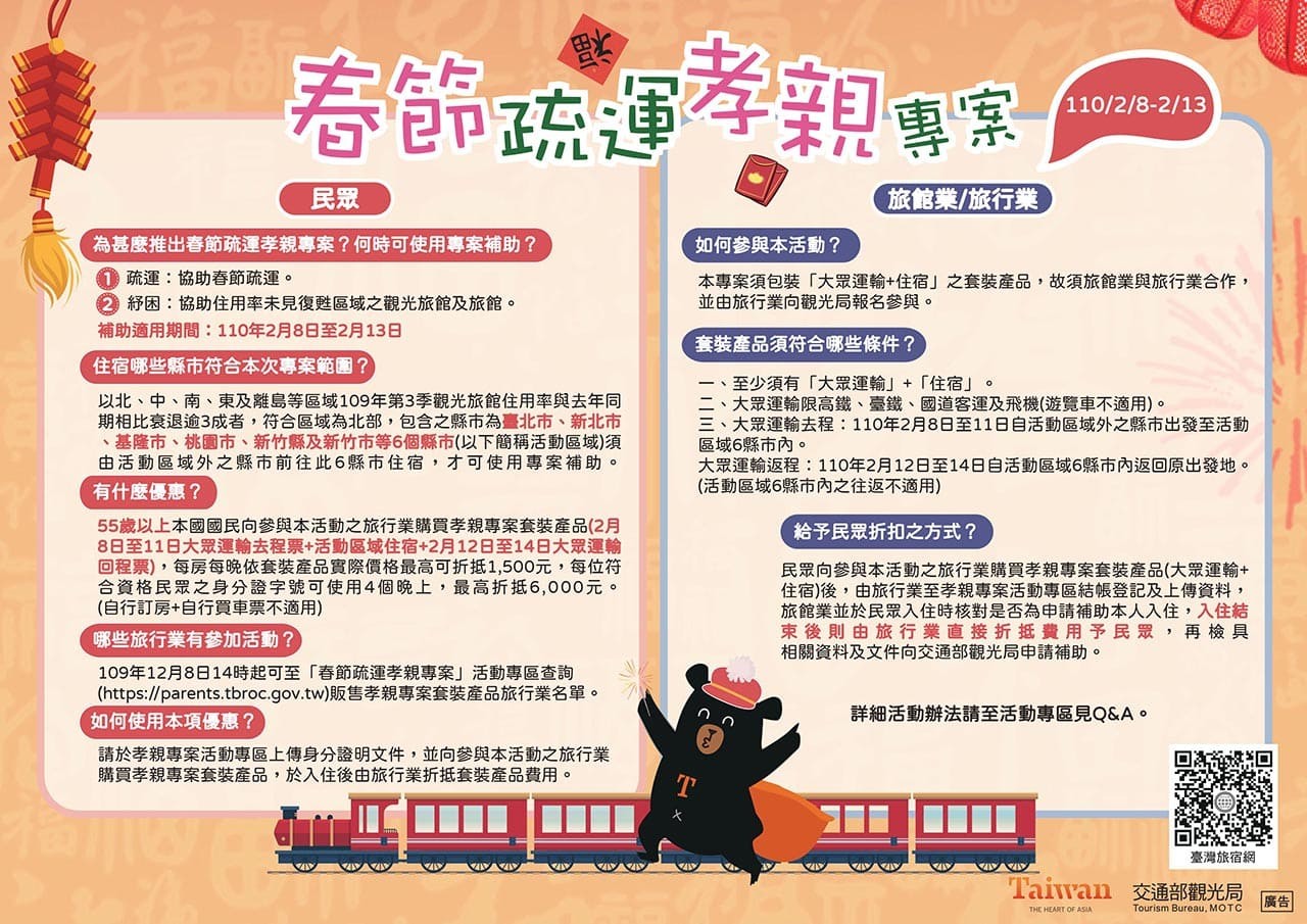 為協助紓緩春節返鄉車潮,鼓勵民眾搭乘大眾運輸工具,並對於旅館業住用率未見復甦之區域予以紓困,故以疏運及紓困為目的,辦理「春節疏運孝親專案」住宿優惠補助,鼓勵長輩搭乘大眾運輸到優質的旅館闔家團圓過春節。