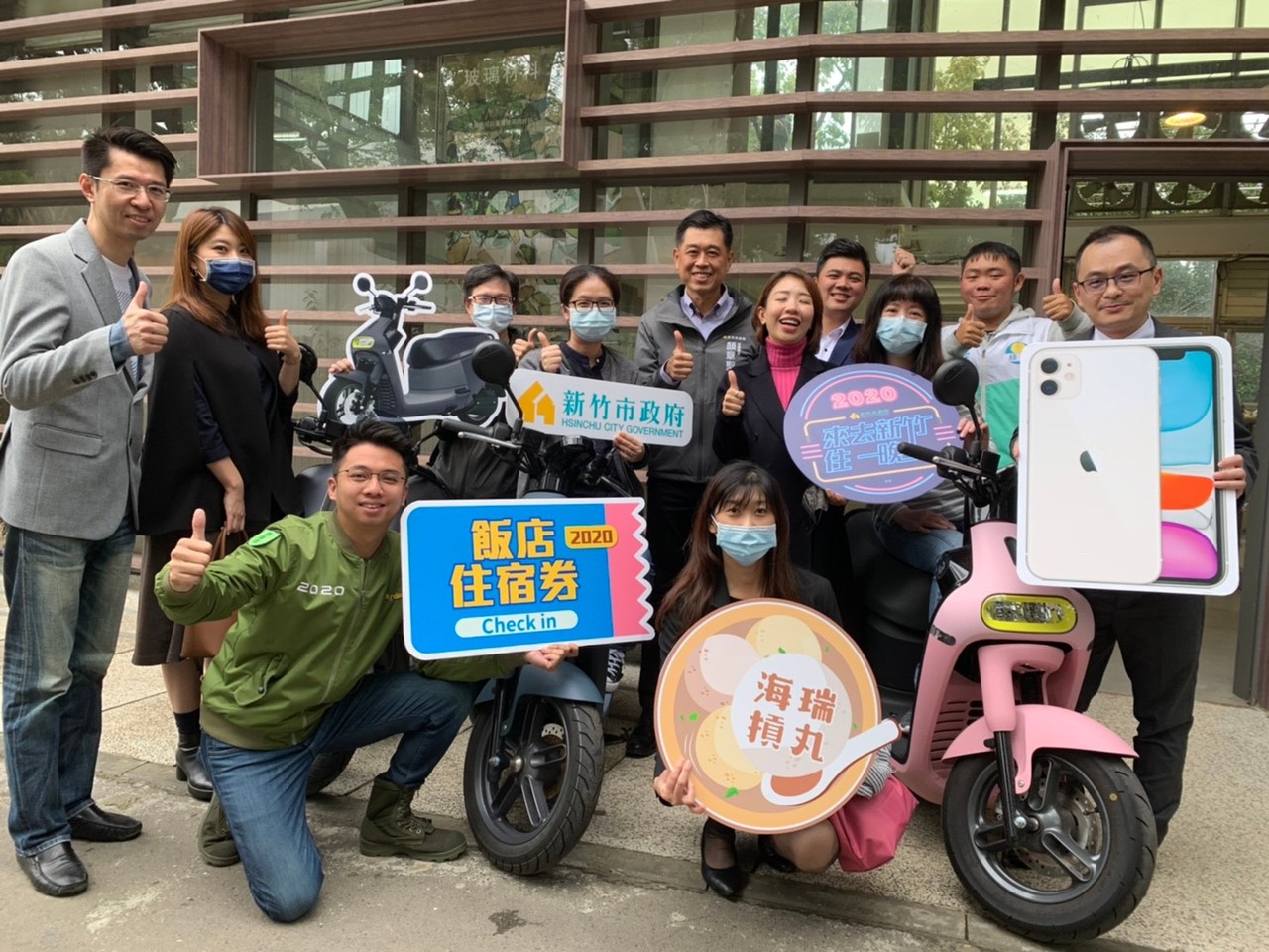 新竹市政府結合交通部觀光局「安心旅遊自由行住宿優惠活動」加碼推出「來去新竹住一晚-好玩券」消費折抵及抽獎活動,活動抽獎結果已經於11月19日在律師的見證下出爐,共抽出Gogoro 3 - 3名、iphone 11 - 9名、飯店住宿券 – 9名以及海瑞摃丸一年份(每月2禮盒)- 1名共計22名得獎者,並於今日(12月9日)在新竹市動物園大象門進行頒獎。