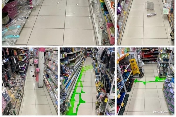 宜蘭縣府東方27.2公里處10日晚間9點19分發生強烈地震,芮氏規模6.7,最大震度4級,震源深度76.8公里,全台各地搖晃有感。受到地震影響,桃園一處小北百貨貨架上的商品掉落到地上,還有清潔劑打翻,綠色的液體流得滿處都是。