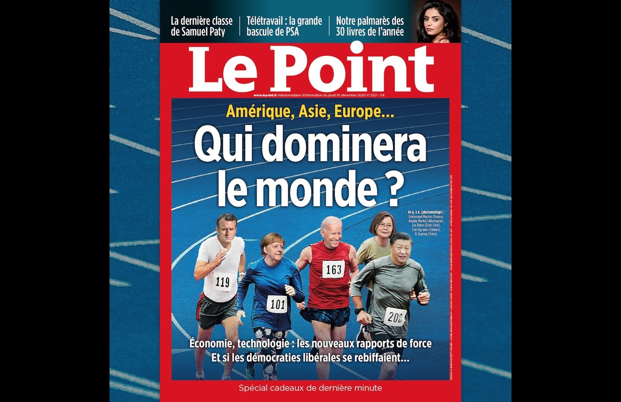「重點週刊」(Le Point)本期主題為「美洲、亞洲、歐洲…誰將主宰世界?」封面是世界五大領袖爭鋒賽跑,除了法國總統馬克宏(Emmanuel Macron)、德國總理梅克爾(Angela Merkel)、中國領導人習近平以及美國總統當選人拜登(Joe Biden)外,也有台灣總統蔡英文。
