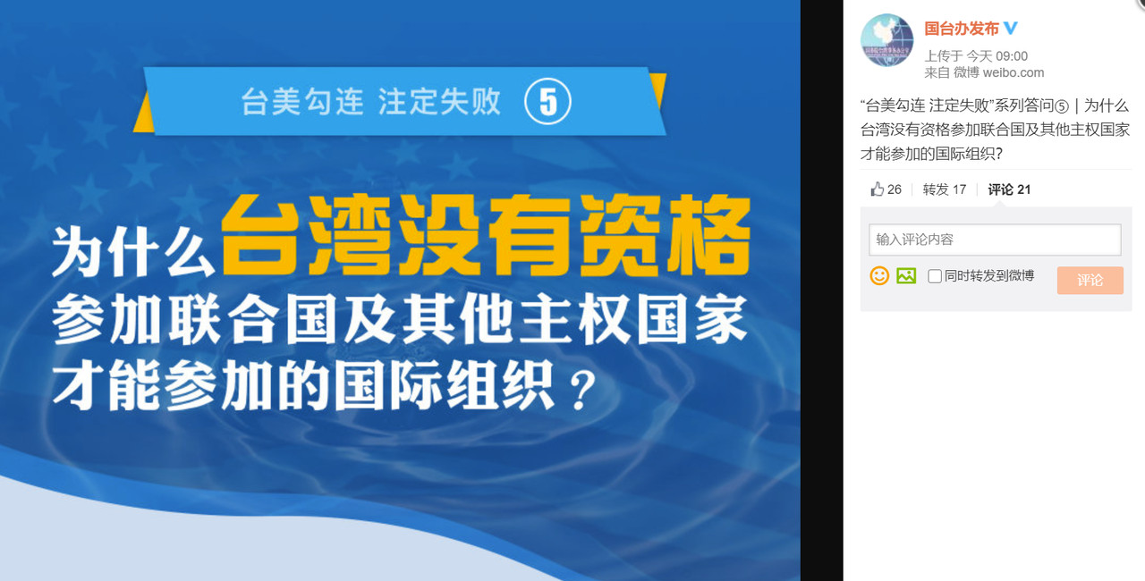 大陸國台辦自9日起,一連3天在官方微博上發布該系列答問圖解,到今日共5則,內容涵蓋中美三個聯合公報、美國「借台灣問題干涉中國內政」、美對台軍售、台灣依美謀獨、國際組織參與等。