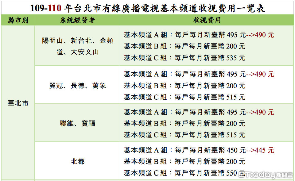 ▲台北市109-110年有線電視基本頻道收視費用一覽表,紅字部份是110年調降的部份(資料來源:NCC、台北市政府)