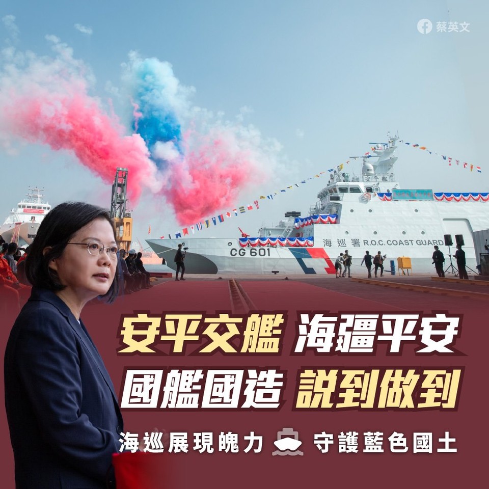 蔡英文透過臉書指出,「國艦國造」是我們的政策,今天交出來的成果,從船體設計到武器系統都是Made in Taiwan,這就是我們克服萬難,說到做到的證明。