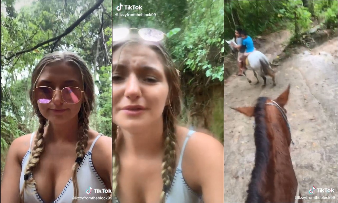 根據《每日星報》報導,美國一名年輕辣妹莉茲11日在影片分享社群TikTok上傳一段影片,她騎著馬匹在森林裡遊蕩,身邊還有2個小男孩也騎著馬,不斷回頭用西班牙語對莉茲說話,但她卻一句也聽不懂。莉茲在影片中用英文解釋,自己現在在「墨西哥」,因為昨天晚上喝醉了,所以她也不知道自己是怎麼到這裡來的,「沒有人跟我說同一種語言,他們聽不懂我說什麼,我不知道我要去哪。」