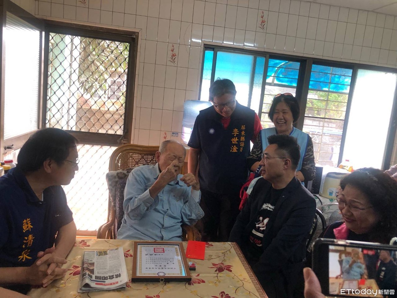 ▲中國國民黨主席江啟臣等人13日下午到東港鎮共和新村,拜訪105歲的黨員金英 。(圖/記者陳崑福翻攝,以下同)