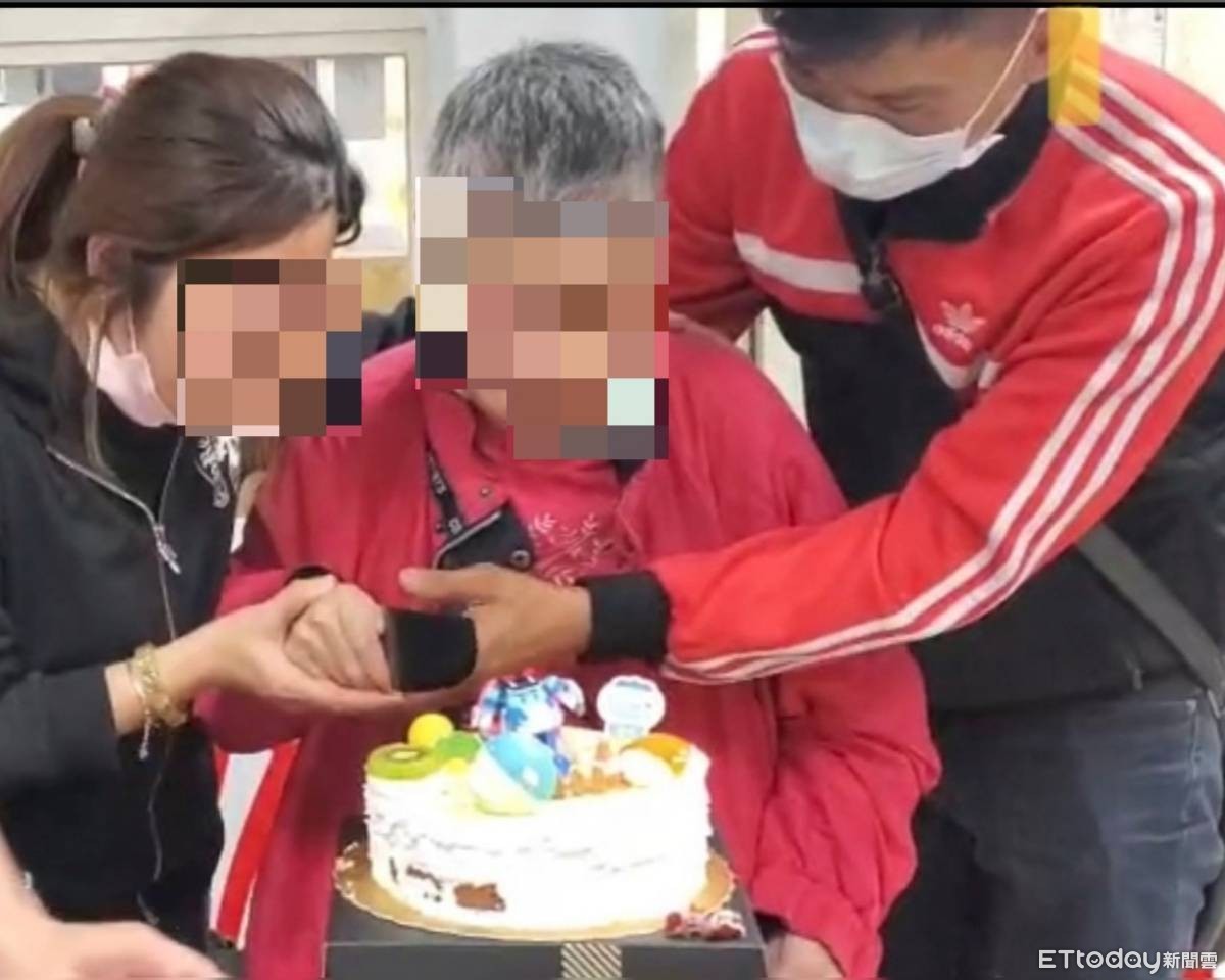 ▲失蹤20年的婦人(中)與女兒女婿切蛋糕團聚。(圖/記者唐詠絮翻攝)