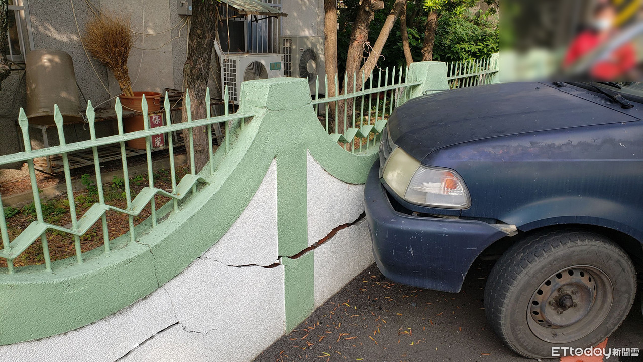 ▲雲林監獄圍牆遭車禍波及,重力撞擊後造成近2米龜裂。(圖/民眾提供)