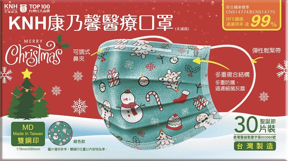 全聯分兩波段開賣「聖誕節口罩」,首波12/12開賣商品為獨家的「康乃馨3D立體兒童醫療口罩-聖誕節(白)」與「康乃馨醫療口罩耳帶-聖誕節(綠)」;而12/16將進行第二波銷售,販售商品為混色款的「康乃馨3D立體兒童醫療口罩-聖誕節(白+綠+紅)」(30片/盒)售價359元、「康乃馨醫療口罩耳帶-聖誕節(白+紅+藍)」(30片/盒)售價299元。