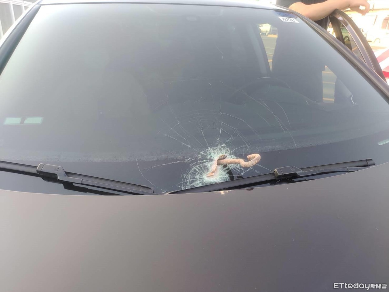 ▲1部自小客車行駛國道1號北向292.1公里處,突然飛來1支鐵插銷,擊中刺穿前擋風玻璃,駕駛人雖未受傷,當場嚇一跳,只要稍微偏移就可能刺中人。(圖/記者林悅翻攝,下同)
