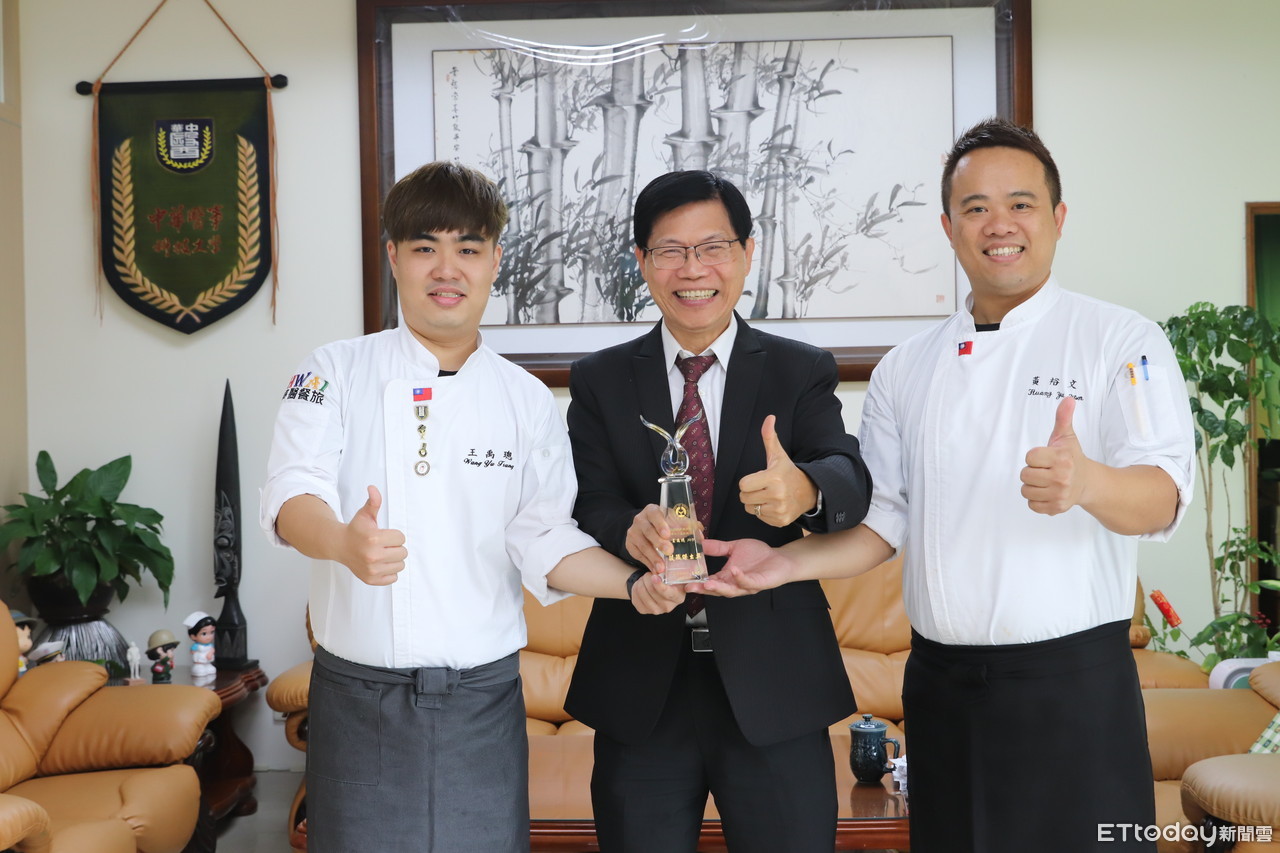 ▲中華醫大餐餐旅廚藝社社長王禹璁(左)獲教育部頒發「技職之光傑出獎」,恩師黃裕文(右)陪同向曾信超校長呈獻成果、分享榮耀。(圖/記者林悅翻攝,下同)