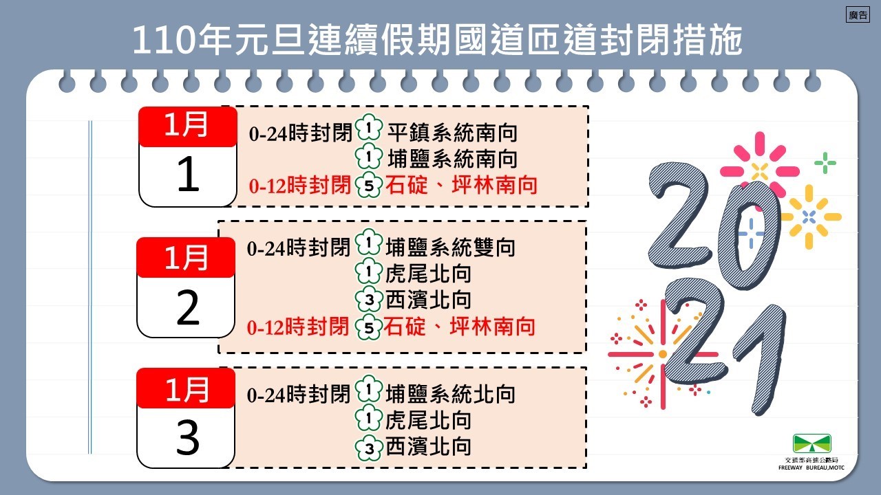 高公局表示,將於元旦連假首日0-24時封閉國1平鎮系統及埔鹽系統南向入口,0-12時封閉國5石碇及坪林南向入口;連假第2日0-24時封閉國1埔鹽系統雙向入口、國1虎尾及國3西濱北向入口,0-12時封閉國5石碇及坪林南向入口;收假日0-24時封閉國1埔鹽系統、虎尾及國3西濱北向入口。