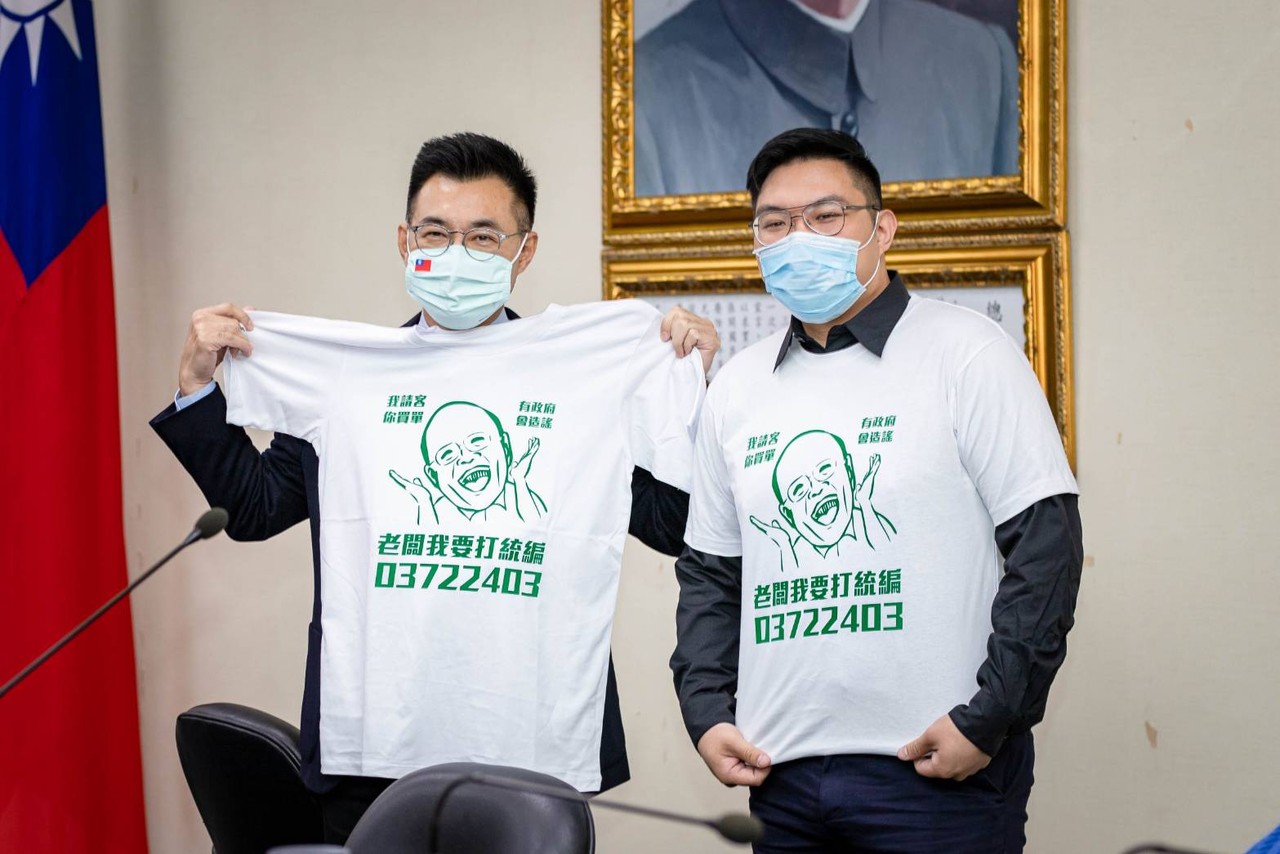 國民黨青年黨團團長陳柏翰以及前團長田方倫、蕭敬嚴,16日於國民黨中央發表行政院統編潮T,衣服印上蘇貞昌開心張手的模樣,還印有「老闆我要打統編03722403」、「我請客你買單」、「有政府會造謠」的字樣,嘲諷民進黨政府近日風波。