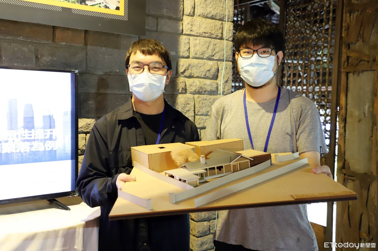 ▲台科大建築系大四學生鄭翔文(左)、郭子榕(右)參與學人新村模型製作。(圖/台灣科技大學提供)