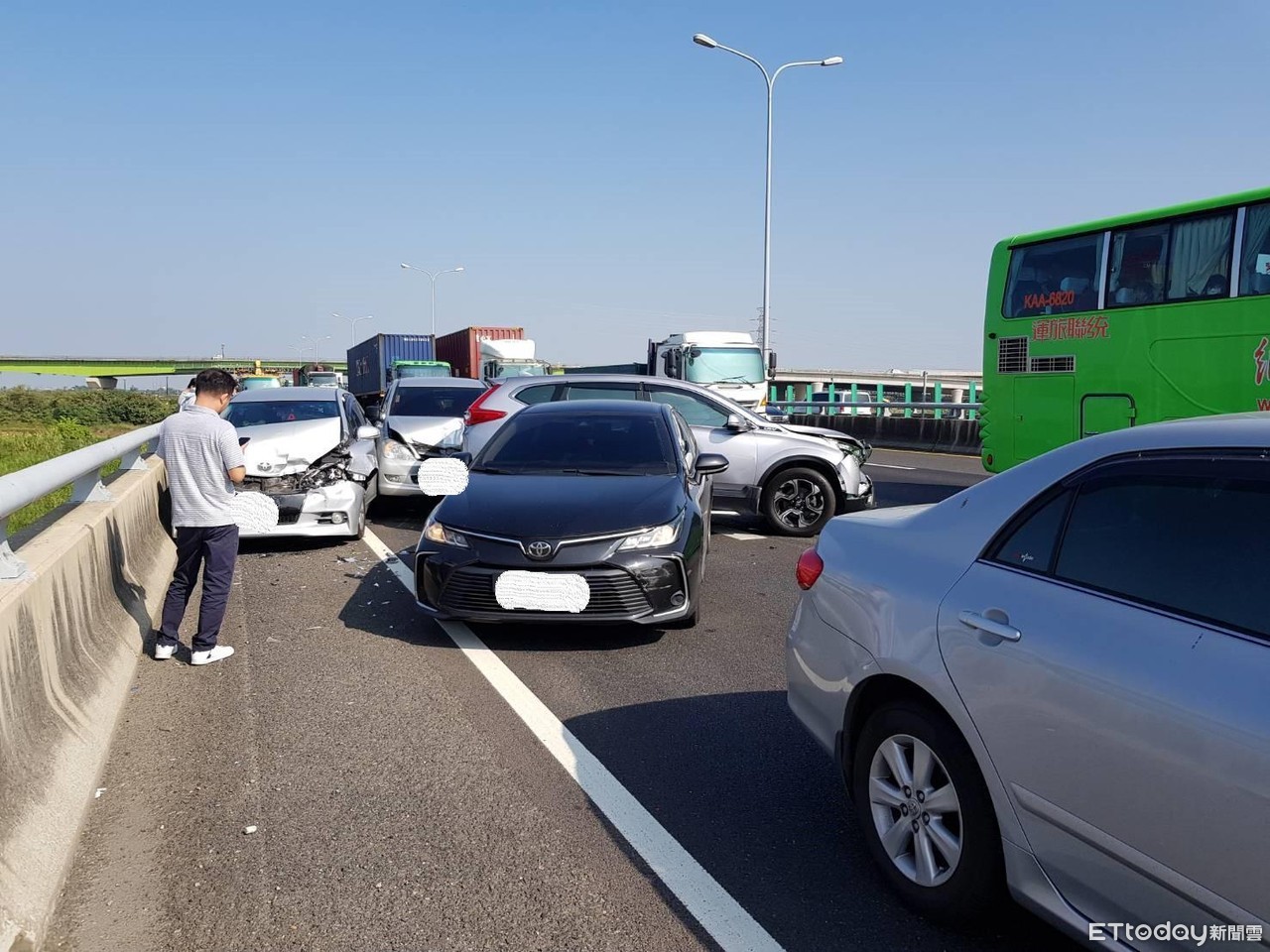 ▲國道1號南向317.9公里處,17日上午10時14分發生一起5車追撞車禍,造成大塞車,幸好無人員傷亡,目前肇事原因及相關責任由國道警察第四大隊調查處理中。(圖/記者林悅翻攝,下同)