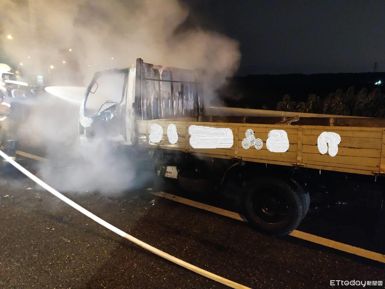 ▲國道1號南向330公里,12月16日深夜發生1起火燒車事件,一部自小貨車,行經該路段時起火燃燒,消防人員迅速撲滅火勢,幸無人員傷亡。(圖/記者林悅翻攝,下同)