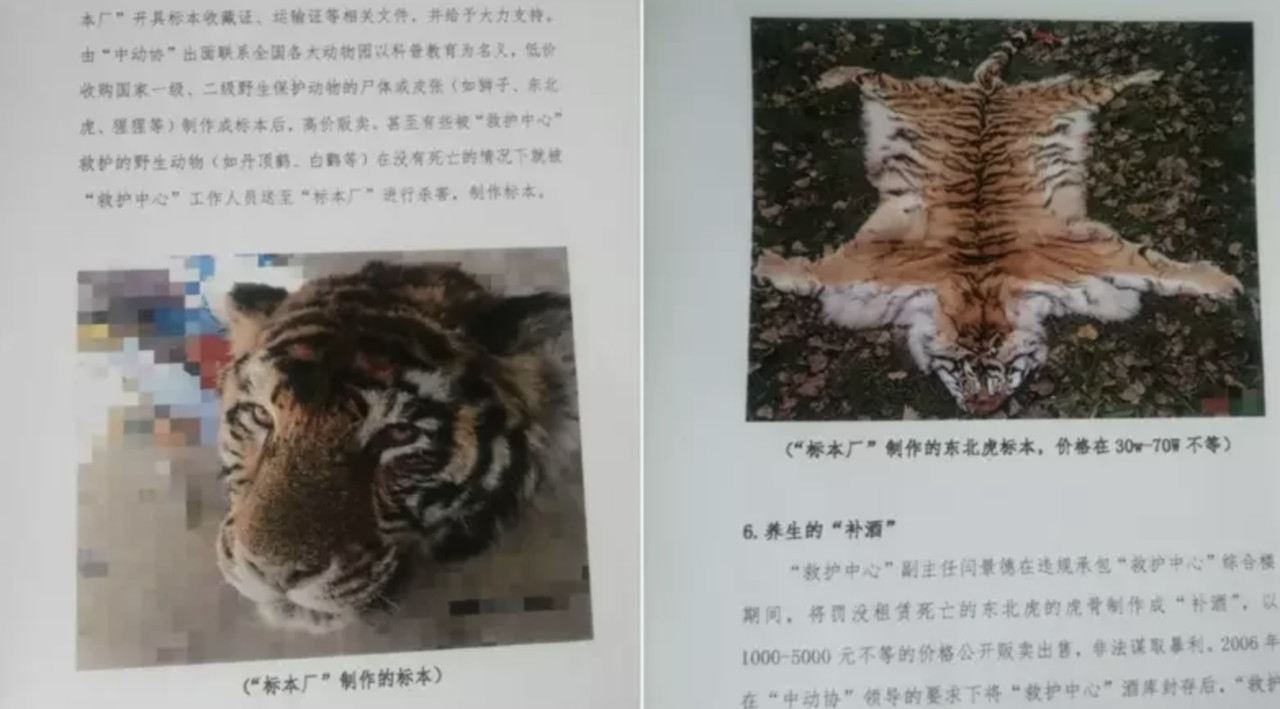 檢舉人提到,除了動物屍體外,有些動物是在還沒死亡的情況下,就被救護中心的工作人員送到標本工廠,殺死做成標本,救護中心的一名副主任還將東北虎的虎骨製成「虎酒」公開販售。