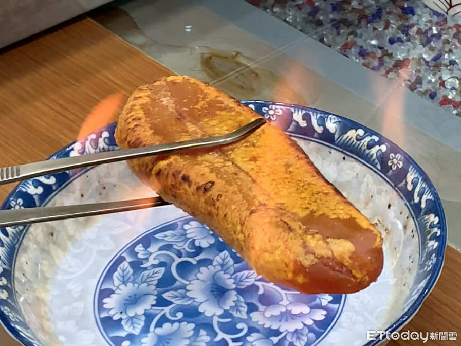 ▲烏魚子料理方式最簡單的即是使用58度高粱點火炙燒。(圖/記者蔡佩旻攝)