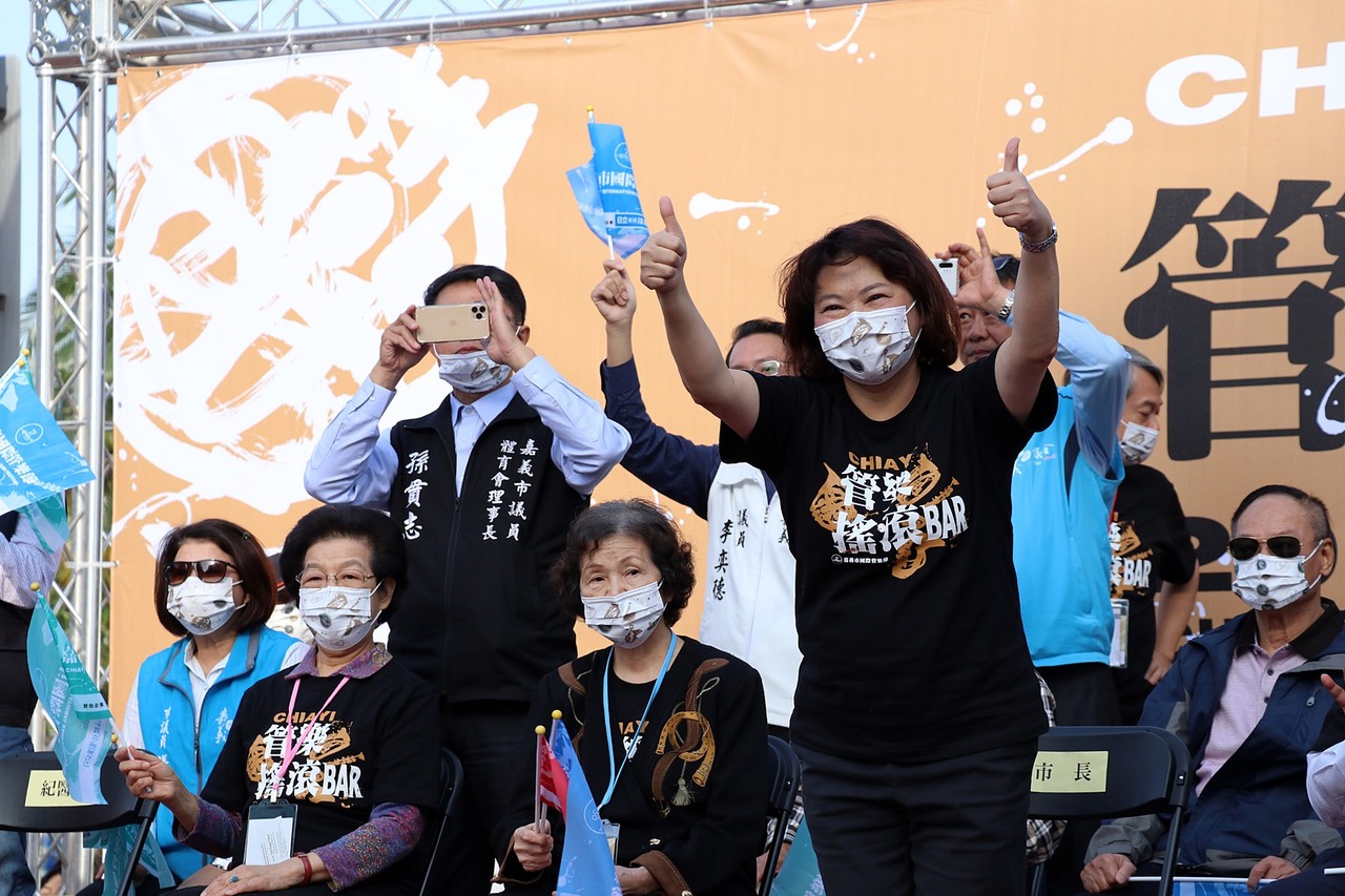 ▲嘉義市長黃敏惠於國際管樂節為各表演團體吶喊加油,並大秀管樂節防疫口罩。(圖/嘉義市政府提供)