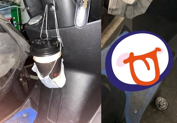 不過,疑似騎車過程不順,男子過沒多久,又張貼了一張照片,飲料的杯子已經不見,剩下口罩掛在掛鉤上,踏板處灑滿飲料,杯蓋還掉在地上。