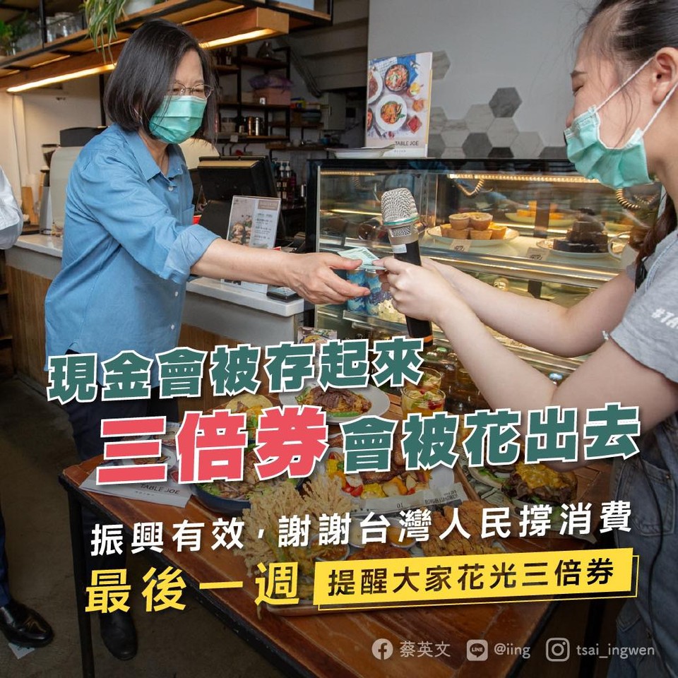 蔡英文19日於臉書發文表示,政府發三倍券,主要是為了「振興」,而當時台灣走過防疫和紓困兩個關卡,此時需要的是人民要把錢花出去,讓消費市場恢復正常。