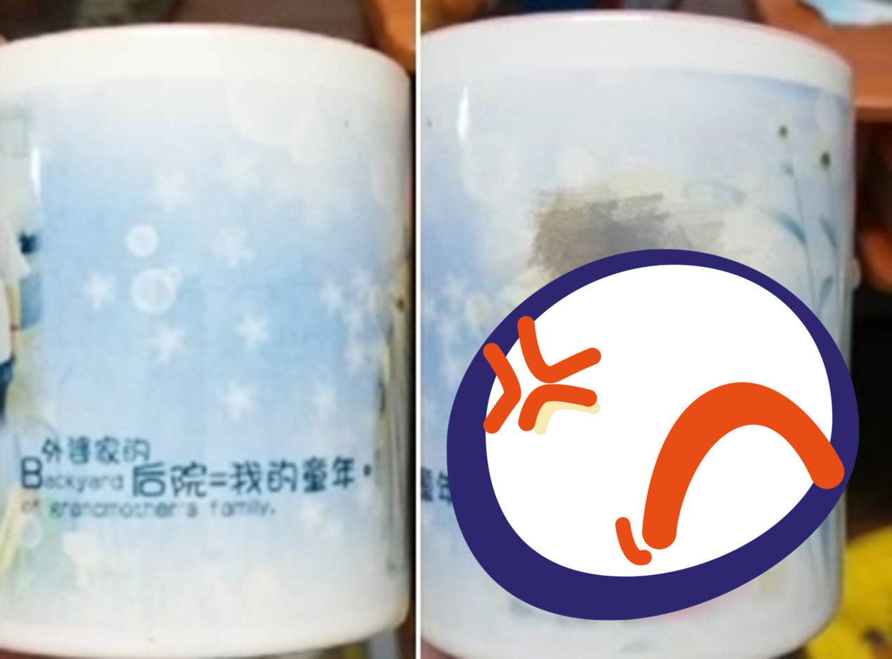 這位媽媽在臉書社團「爆廢公社二館」表示,「兒子抽到籤王…」學校規定小朋友要準備100元以內的禮物來交換,結果竟然有家長拿家裡不要的物品來換。兒子帶回的白色馬克杯上頭,有著顏色泛黃的轉印照片,4個陌生人的臉直接印在杯子上,連兒子看了也很錯愕,讓她尷尬表示,「想跟這位家長說…您家裡的垃圾我們已經幫您處理好丟進回收了喲。」