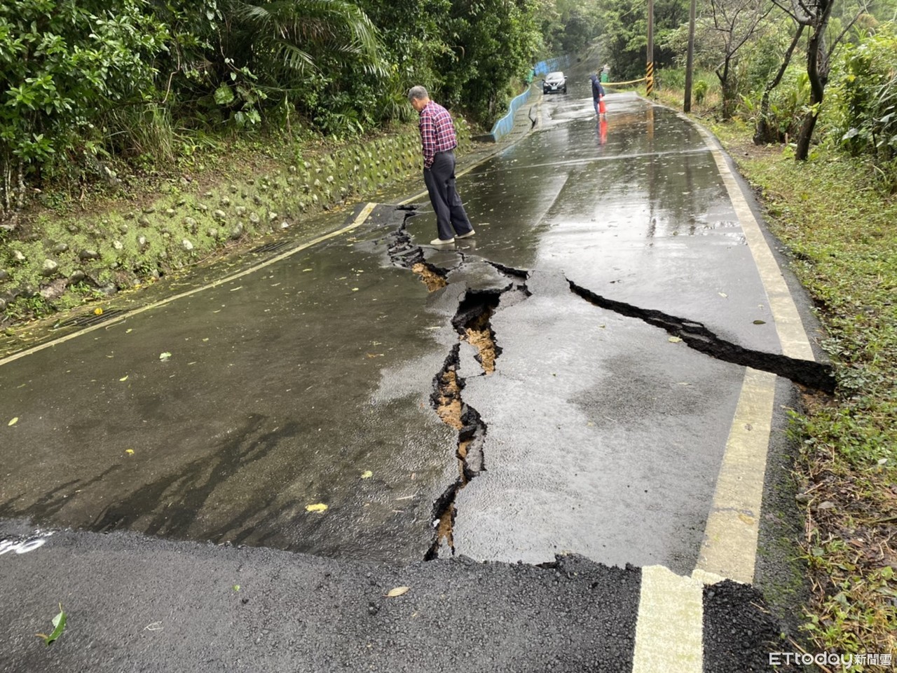 ▲新北市石門區北21線約10.5公里處,發生邊坡滑動,造成路面龜裂隆起。(圖/記者郭世賢翻攝,下同)