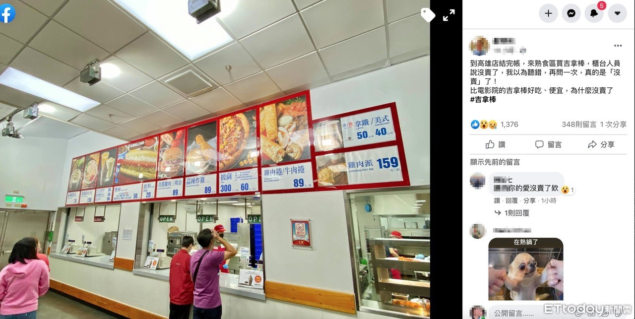 這名男子在臉書社團「Costco好市多 商品經驗老實說」中分享,他到高雄的好市多購物,結帳完以後,想要吃熱食區的吉拿棒,便前往櫃台點餐。不過,男子點了吉拿棒,卻被工作人員告知「沒賣了」,感到晴天霹靂,再問了一次,確認是「真的沒賣了」以後,開始不斷哀號,「比電影院的吉拿棒好吃、便宜,為什麼沒賣了!」