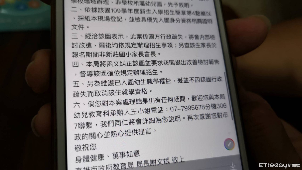 高雄教育局表示,該園於2020年3月經辦109學年度招生作業時,「由於園方作業疏失,致文件審查未完備,教育局將函文糾正該園,並要求限期提出檢討改善報告」,後續並加強督導園方依規定辦理招生作業。另,「為顧及已入園幼生就學權益,爰不因園方作業疏失而取消該生就學資格」,也重申維護弱勢幼兒就學權益。