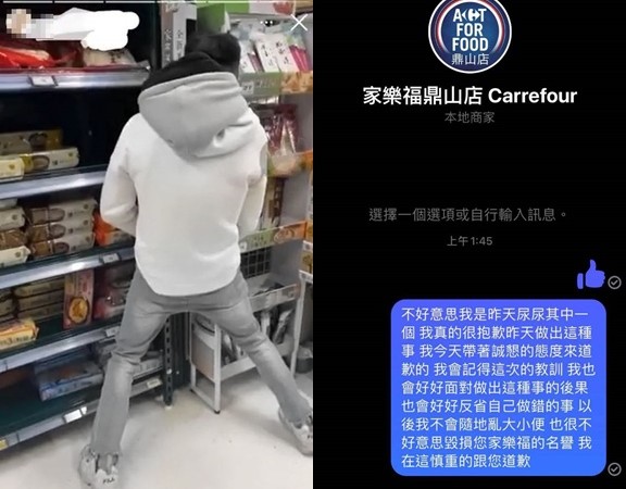 今(22)日清晨2點左右,一名男網友以匿名身分PO出2張截圖,從畫面可見,2名男同學似乎都在半夜1點45分左右以訊息的方式向家樂福鼎山店道歉。其中一則內容寫道,他是在家樂福小便的其中一人,「做出這種事真的很抱歉,我很誠懇的在這邊跟家樂福道歉,同時也很誠懇的向幫我們清理善後的工作人員道歉」,這次「真的玩過頭了」,他將會記取教訓、好好反省,很抱歉做出傷害店家名譽的事情;而另則道歉內容也大同小異,同樣表明自己會好好反省,「以後我不會隨地亂大小便」,將面對自己做出這種事情的後果。